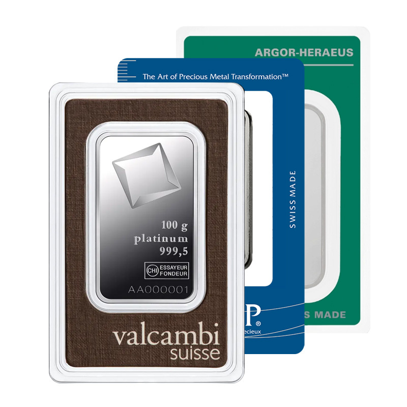 - Sztabka platyny o masie 100g renomowanych producentów z akredytacją LBMA. Sztabki wysyłamy losowo.