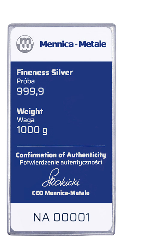 Sztabka z czystego srebra 1 kg, czystość 999,9 (4N) Mennica Metale